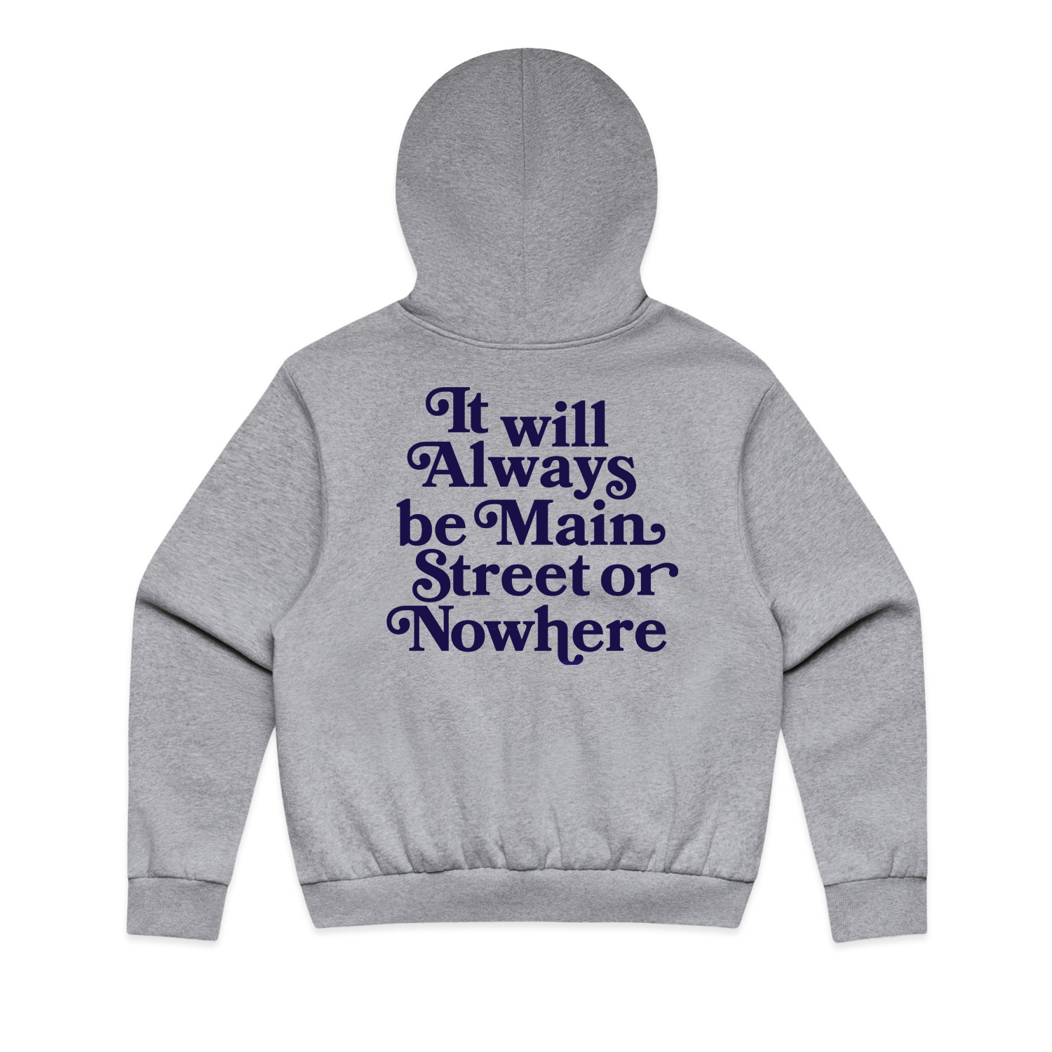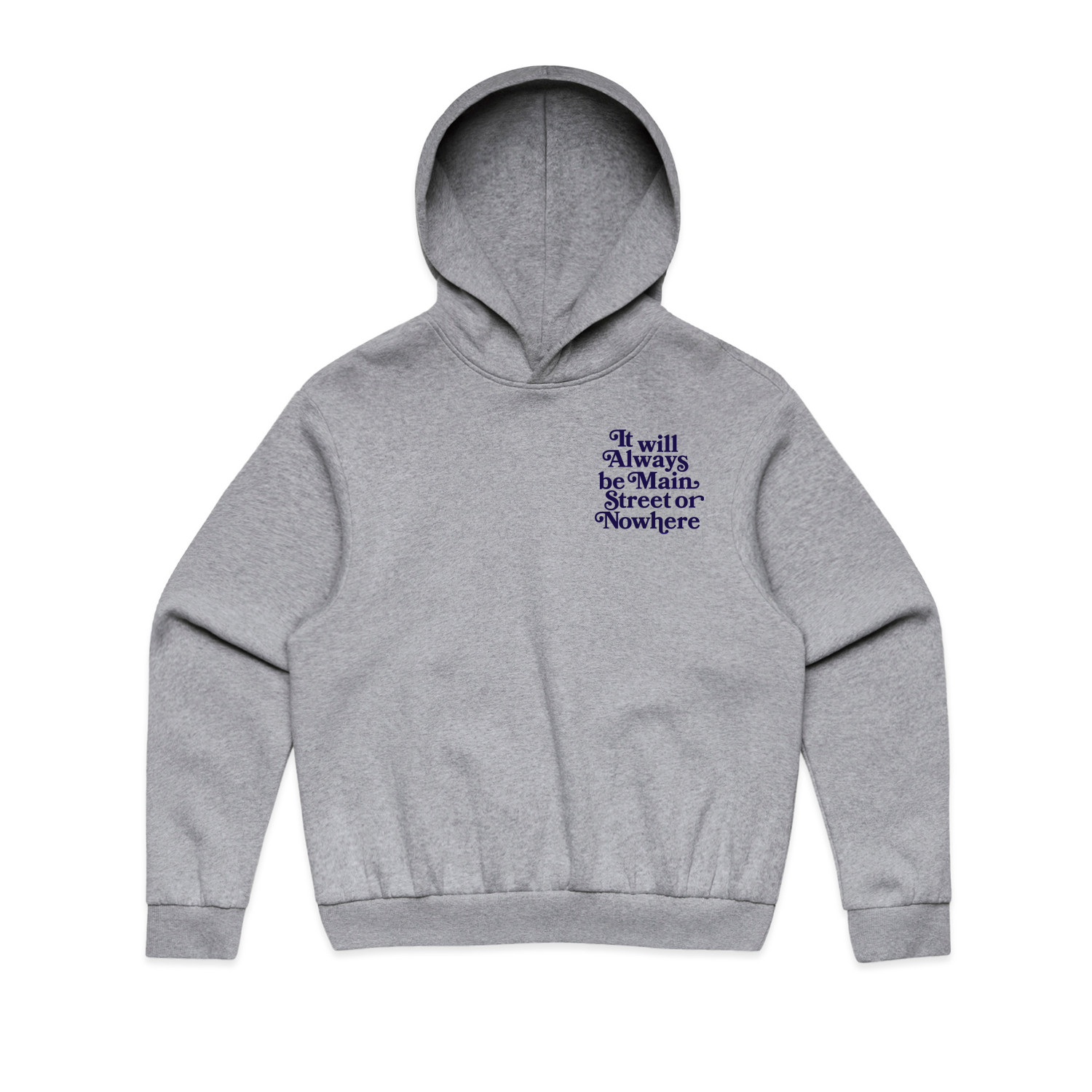 Where nostalgia meets the streets. Our signature grey hoodie embodies everything Main Street or Nowhere stands for – timeless comfort with an edge that knows no boundaries.
